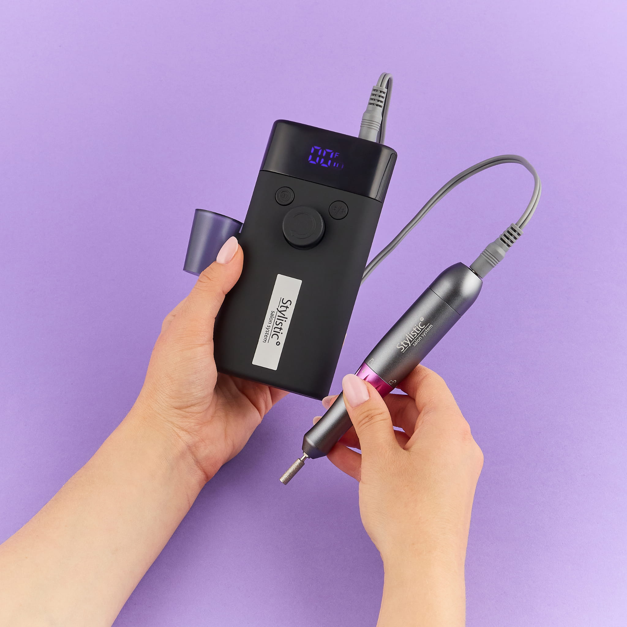 Czarna baza urządzenia w połączeniu ze stalowo-fioletową rączką tworzy elegancki, a zarazem nowoczesny wygląd. Solidna, mocna rączka gwarantuje precyzję i wygodę nawet podczas długich sesji stylizacji. Pasuje do standardowych frezów o średnicy trzpienia 2,35 mm.