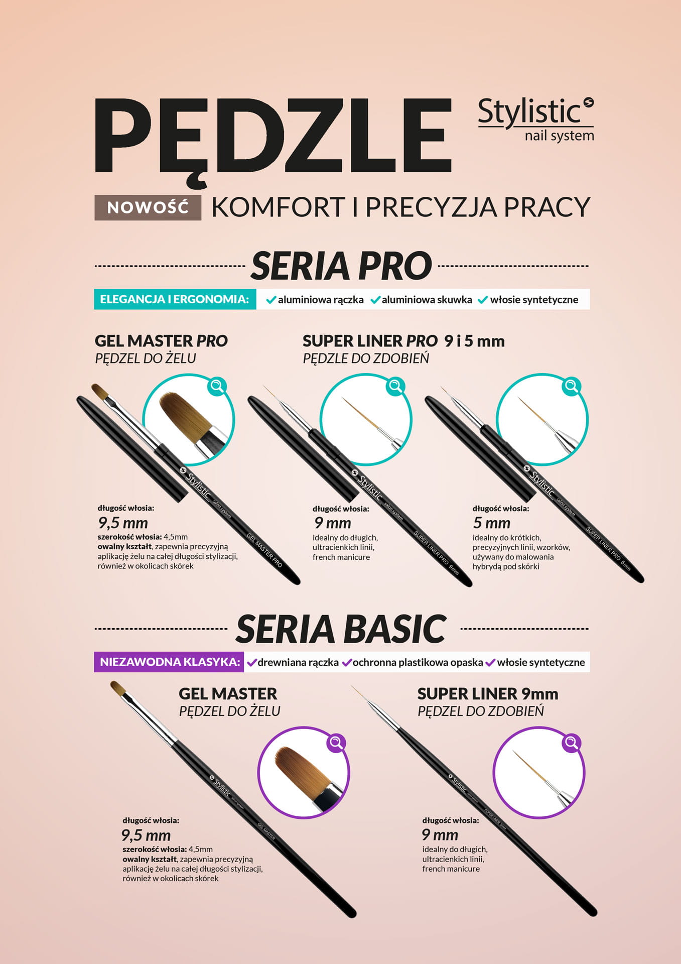 Pędzelek Gel Master Pro od marki Stylistic to obowiązkowy element wyposażenia każdej manicurzystki. Ten płaski pędzel o owalnym kształcie idealnie nadaje się do pracy żelem. Dzięki zaokrąglonej końcówce pędzelek zapewnia precyzyjną aplikację w obrębie skórek. Wysokiej jakości włosie syntetyczne, spięte metalową opaską, osadzone na drewnianym trzonku , zapewnia komfort i wygodę pracy.