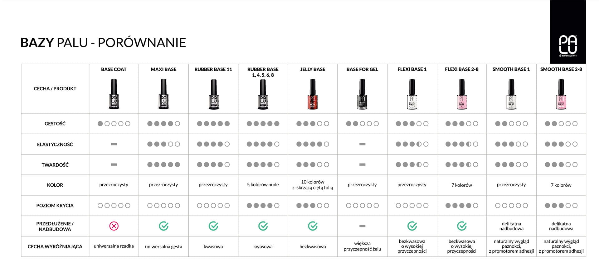 Kauczukowa baza Palu Rubber Base to idealne rozwiązanie dla wilgotnej, cienkiej i problematycznej płytki. Paleta kolorów obejmuje 20 odcieni nude (w tym 10 z drobinkami), które sprawdzą się idealnie do french manicure, a także mocniejszy róż do stylizacji baby boomer i kryjącą biel. Produkt wyrównuje i nadbudowuje płytkę. Nie należy łączyć go z primerem.