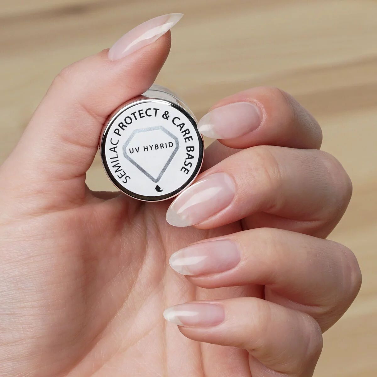 Nakładanie bazy Semilac Protect & Care Base jest łatwe i przyjemne – nie będzie stanowić problemu nawet dla osób dopiero zaczynających przygodę ze stylizacją paznokci. Na początek opracowujemy płytkę paznokcia i odtłuszczamy ją Semilac Nail Cleanerem. Nakładamy warstwę Semilac Protect & Care Base i utwardzamy pod lampą (czas utwardzania zależny jest od mocy posiadanej lampy). Następnie nakładamy cienką warstwę dowolnego lakieru hybrydowego Semilac i utwardzamy ją w lampie. Ponownie nakładamy warstwę kolorowego lakieru z oferty Semilac (pamiętając każdorazowo o zabezpieczeniu wolnego brzegu) i całość utwardzamy w lampie. Wykonaną stylizację zabezpieczamy dowolnym topem Semilac i utwardzamy pod lampą. Stylizacja gotowa.