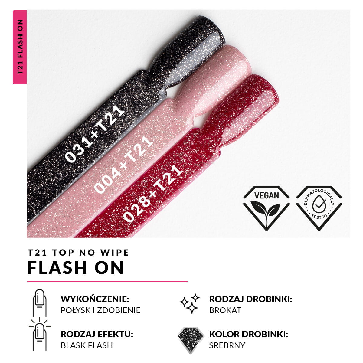 Top Flash ON to błyszczący top hybrydowy w sprawdzonej formule no wipe, niewymagającej przemywania, w którym zatopiliśmy mnóstwo mieniących się srebrnych drobinek, które przy odpowiednim świetle lampy błyskowej migoczą niewiarygodnym blaskiem. Już dzisiaj zdumiewający i bardzo popularny efekt blasku flash na paznokciach możesz uzyskać na swoim ulubionym kolorze manicure. Top można zaaplikować zarówno na lakiery hybrydowe jak również żele. Jego intensywność zależy od natężenia i kąta padania światła.