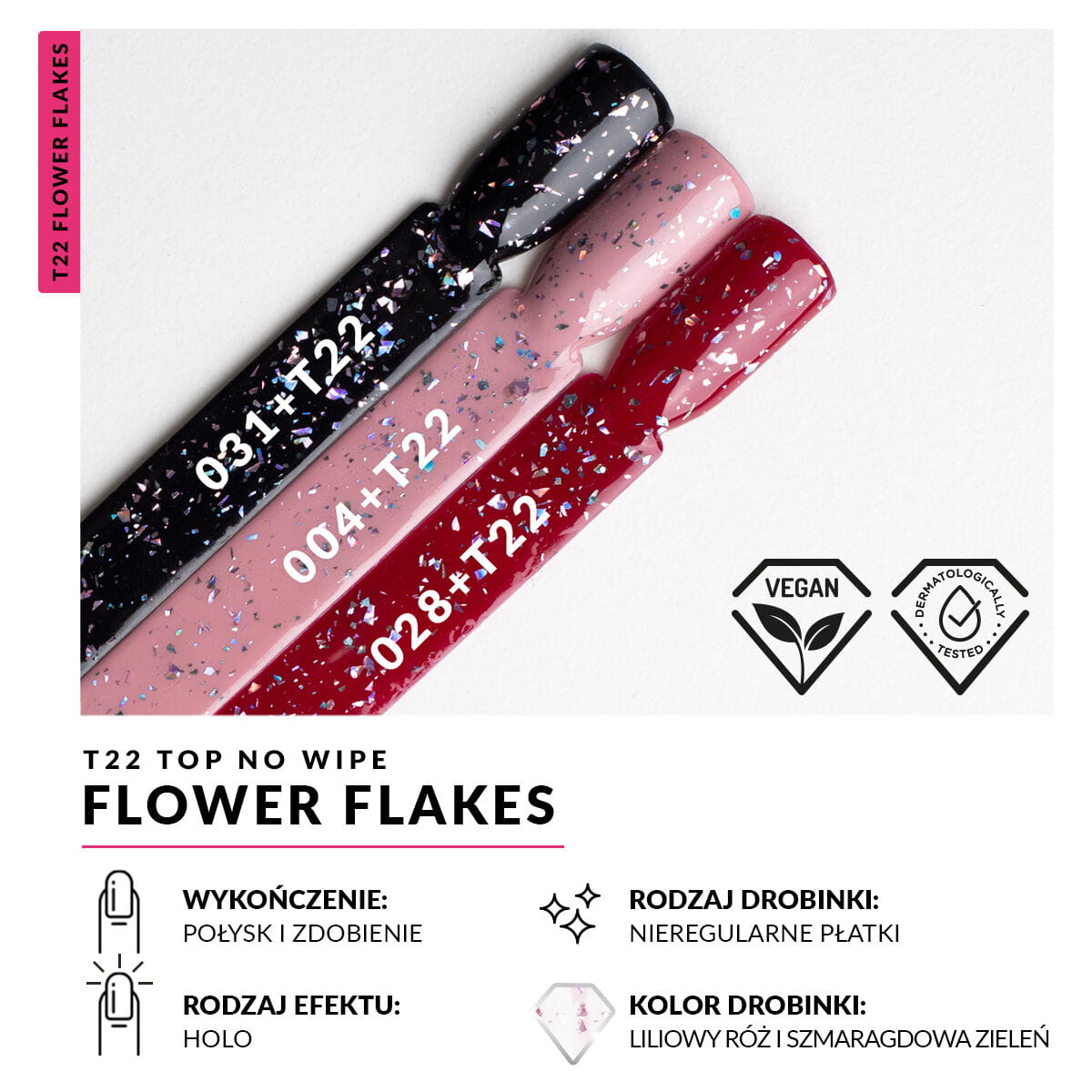 Top Flower Flakes to prosty sposób na odmianę Twojego ulubionego manicure. W sprawdzonej formule No Wipe nie wymagającej przemywania zatopiliśmy połyskujące, maleńkie płatki w przepięknym połączeniu koloru liliowego różu i szlachetnego szmaragdowego srebra. W zależności od kąta padania i intensywności światła Twojego paznokcie będą połyskiwać głębią efektu holo. Przepięknie prezentuje się w połączeniu ze wszystkimi odcieniami nude oraz pastelowymi. Top nie posiada warstwy dyspersyjnej i nie wymaga przemywania Nail Cleanerem i charakteryzuje się konsystencją podobna do Semilac Top No Wipe. Przed każdym użyciem dokładnie wymieszaj produkt.