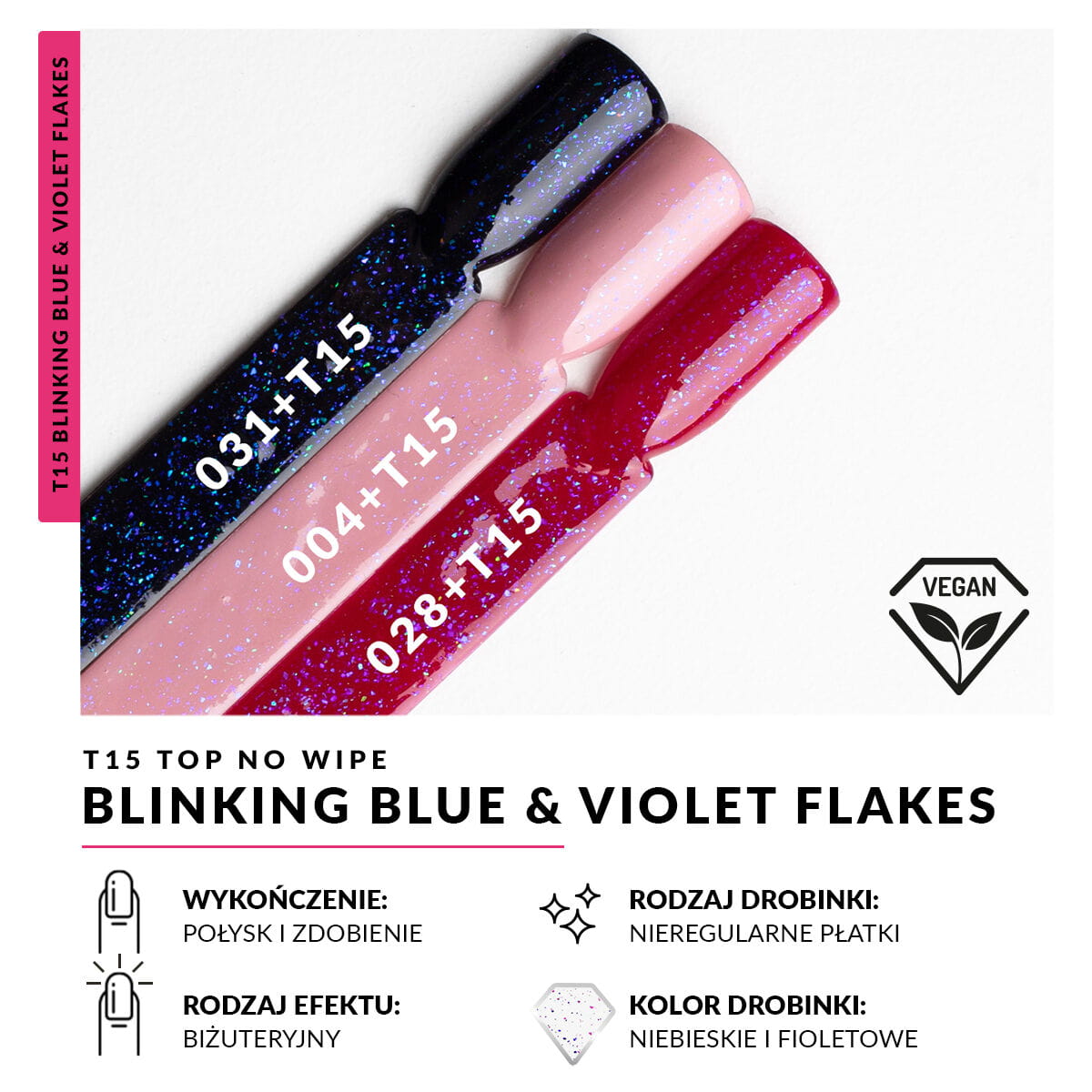 Domowy sposób na prostą odmianę Twojego ulubionego manicure. W sprawdzonej formule No Wipe niewymagającej przemywania zatopiliśmy tysiące, różnej wielkości mieniących się płatków w przepięknych odcieniach błękitu i fioletu. Użycie Topu na zwieńczenie jasnej stylizacji – doda jej iskrzącego się błysku w odświeżającym połączeniu barw stonowanego błękitu i odważnego fioletu, zastosowany przy manicure w ciemnych kolorach wydobędzie głębię tonacji płatków w stylizacji, w prosty sposób odmieniając Twoje paznokcie.