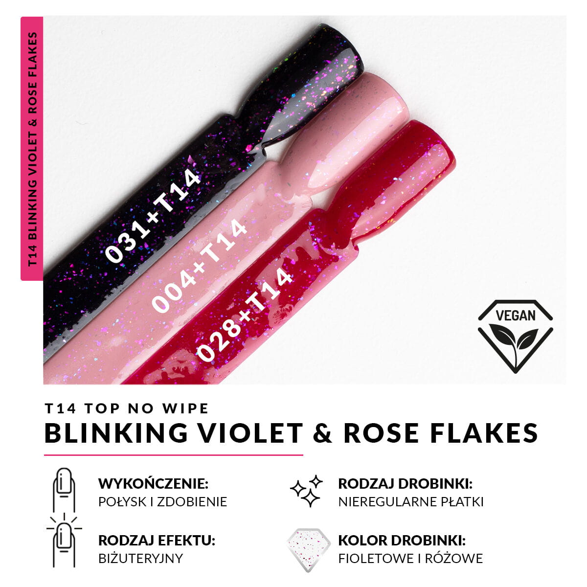 Top No Wipe Blinking Violet & Rose Flakes to domowy sposób na prostą odmianę Waszego ulubionego manicure. W sprawdzonej formule No Wipe niewymagającej przemywania zatopiliśmy tysiące, różnej wielkości mieniących się płatków w idealnym duecie barw fioletowo-różowych. Użycie Topu na zwieńczenie jasnej stylizacji – doda jej iskrzącego się błysku w pastelowych kolorachróżu i fioletu, zastosowany przy manicure w ciemnych kolorach wydobędzie głębię odcieni płatków w stylizacji, w prosty sposób odmieniając Wasze paznokcie.